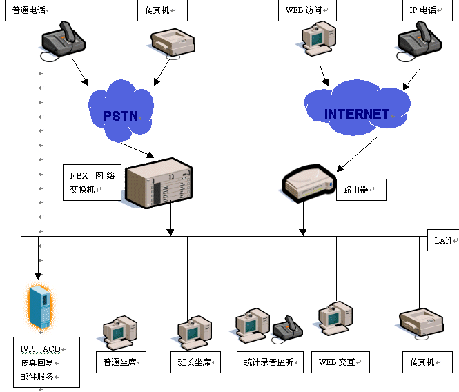 基于NBX 網絡交換機的呼叫中心對外部有PSTN和IP兩種接口,可以接入各種類型用戶:普通電話用戶、傳真用戶、WEB訪問用戶、IP電話用戶。NBX呼叫中心通過NBX網絡交換機將外部的PSTN信號轉換為以太網數據包信號,在呼叫中心內部通過局域網提供話音與數據服務的集成,從而即以開放的局域網包交換技術實現(xiàn)專用 PBX的話音服務功能并與現(xiàn)有局域網無縫集成,從而實現(xiàn)包括E-mail、傳真、聊天工具、視頻以及話音在內的由多種通信媒介的交互。NBX呼叫中心通過統(tǒng)一的ACD將各種通訊方式的訪問協(xié)調分配,最終實現(xiàn)了呼叫的中心運營和諧與高效。