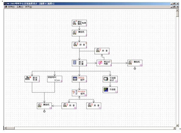 NV-IVR是一個使用方便、功能強大支持持續(xù)開發(fā)的開放式產品。NV-IVR運用圖形化按鈕,直觀顯示各個子模塊的主題,使用者只要通過簡單的拖曳、配置就可以生成一棵樹狀流程圖,直觀地對照IVR的實際運行流程。用戶需要對實際流程進行修改,只須對流程圖修建即可。NV-IVR可以完成以下一些主要功能: