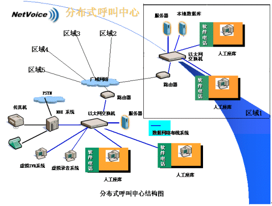 由于代理技能差異、語言差異、呼叫量的差異,以及客戶中心客戶所在地的變化及每個客戶對各自所擁有的用戶資料的保密性需求,分布式呼叫中心往往更適合各類企業(yè)的實際。分布式呼叫中心的建立,意味著需要在多個分中心之間進行統(tǒng)一的呼叫控制及語音與同步數據轉移。NBX網絡交換機的引入,兩網合一的特性使分布式呼叫中心的建立成為了一件非常容易的事情。呼叫中心可以擴展到多個位于不同地域的局域網上,通過路由選擇可以自動地把呼叫(