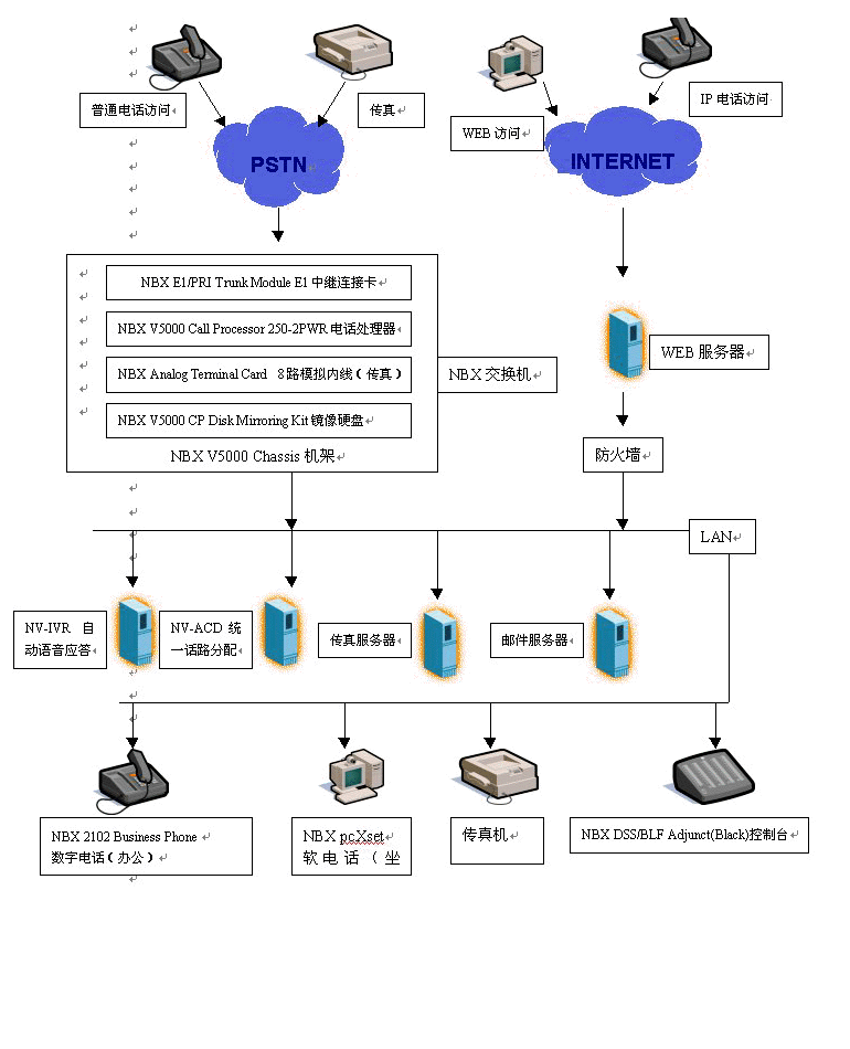 基于NBX的呼叫中心對外支持PSTN、IP兩種接入方式,可以實現(xiàn)各種接入:普通電話、傳真、IP電話、郵件、WEB訪問,NBX呼叫中心在技術上實現(xiàn)革命性的突破,在內部實行語音數據兩網合一,將外部的模擬數據轉換為以太網數據包,由NV-ACD實現(xiàn)外部各種訪問的統(tǒng)一路由分配。