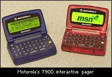 “Talkabout T900”是摩托羅拉公司為微軟MSN專門設(shè)計(jì)生產(chǎn)的一種雙向?qū)ず魴C(jī),它由一個緊湊型的小鍵盤和一個可以容納4行消息的屏幕組成,設(shè)計(jì)小巧,攜帶方便,可以方便用戶收發(fā)MSN提供的Hotmail免費(fèi)郵件服務(wù)、接收短消息以及訪問MSN上的其它服務(wù),比如及時的股市行情、警示消息等等。
