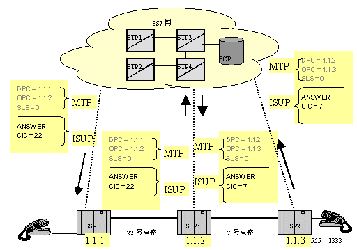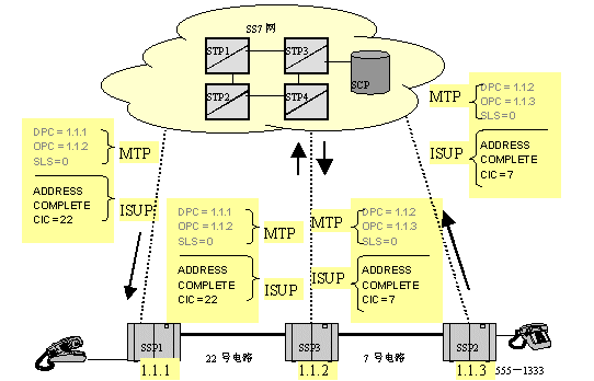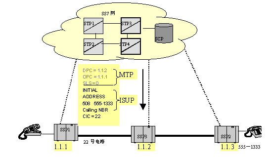 如下圖所示,當(dāng)一個用戶摘機并拔被叫號碼,交換局(SSP1)收集并分析被叫號碼,分析到被叫不是本局內(nèi)用戶,而是目的信令點編碼為1.1.3交換局的用戶,于是,SSP1在路由表中查找到達(dá)1.1.3的路由,然后用找到的鏈路把IAM消息發(fā)送出去,如圖中箭頭所示。