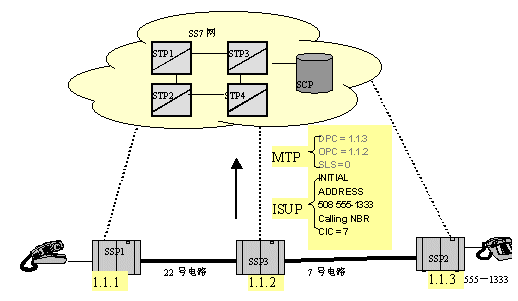 當(dāng)消息(IAM)到達(dá)路由中下一個交換點1.1.2時,MTP層再次分析路由。在1.1.2中,MTP查找目的信令點編碼,并發(fā)現(xiàn):這個消息不是發(fā)給自己的,然后就找出轉(zhuǎn)發(fā)這個消息的路由及具體的鏈路。