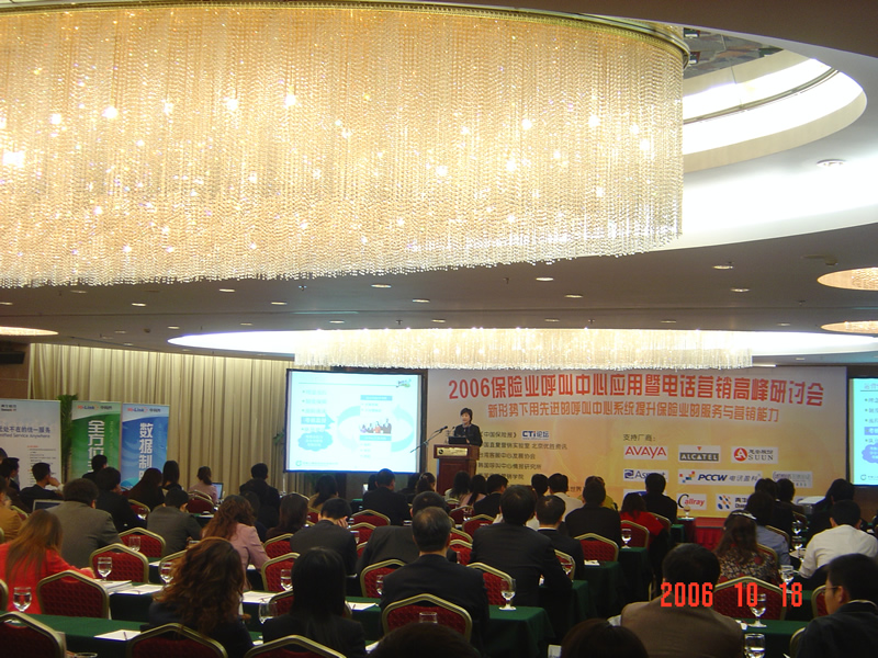 。。2006年10月18日,2006保險(xiǎn)業(yè)呼叫中心應(yīng)用暨電話營(yíng)銷(xiāo)高峰研討會(huì)在北京天鴻科園大酒店隆重召開(kāi),以下是會(huì)議現(xiàn)場(chǎng)的相關(guān)圖片報(bào)道: