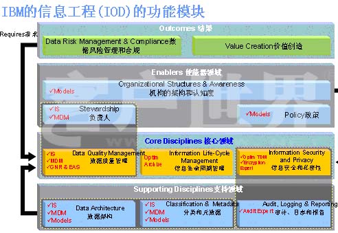 具體一點實際上信息工程分11大模塊,我們從底層往上看,首先是數(shù)據(jù)架構(gòu)、進行分析和定義,而且每個數(shù)據(jù)要進行分類,并且對數(shù)據(jù)源的結(jié)構(gòu)做模型。再往上一點我們可以看到怎么樣去管理生命周期,怎么樣去管理數(shù)據(jù)的質(zhì)量,安全和私密性等等;再往上任何信息的使用一定要有公司的策略,公司是什么策略來管理,什么可以開發(fā)給第三方,可以給呼叫中心做、什么不可以,這些問題都需要考慮。像風(fēng)險通過BI的方式提供一些有洞察力的洞察報告。