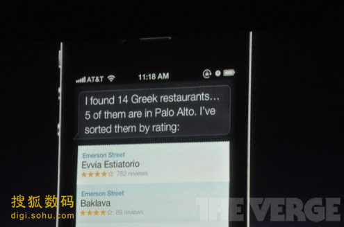 在展示中,F(xiàn)orstall問Siri:“今天天氣怎么樣?”,Siri就播報了今天的天氣預報!霸谂谅灏柾薪o我找一家不錯的希臘餐廳。”,“我找到了14家希臘餐廳,其中5家位于帕洛阿爾托,我會依據(jù)評分列出!