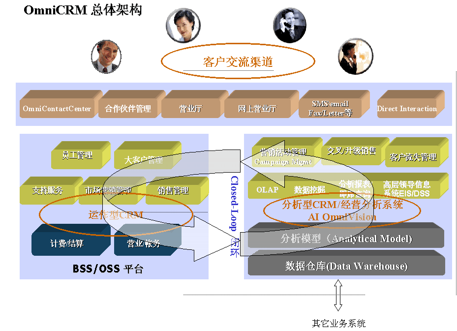 OmniCRM方案是亞信基于多年服務(wù)電信市場的豐富的行業(yè)經(jīng)驗,以及對國內(nèi)運營商業(yè)務(wù)發(fā)展的深刻認(rèn)識而推出的,其中,AI OmniVision是OmniCRM方案中經(jīng)營分析型CRM 的核心產(chǎn)品。AI OmniVision不僅符合行業(yè)業(yè)務(wù)規(guī)范,而且基于對客戶行為、競爭環(huán)境,商業(yè)獲利率以及其他參數(shù)的透徹分析,能夠使運營商充分了解現(xiàn)有客戶、識別并關(guān)注贏利的客戶組、提高服務(wù)質(zhì)量、確保客戶滿意度和忠誠度;同時吸引潛在的客戶;加強提供新服務(wù)的投資回報率;提高效率、減小成本,以實現(xiàn)業(yè)務(wù)價值的最大化。AI OmniVision采用數(shù)據(jù)倉庫、ETL、OLAP分析、靈活報表展現(xiàn)及數(shù)據(jù)挖掘等技術(shù),包含了用戶分析、業(yè)務(wù)分析、收益分析、大客戶分析、營銷分析、競爭分析、服務(wù)質(zhì)量、新業(yè)務(wù)分析等眾多功能模塊。