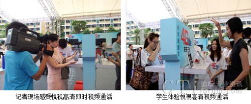 這次在廣州大學(xué)城開展的發(fā)布會,吸引了很多在校大學(xué)生的參加,下圖是記者和學(xué)生現(xiàn)場體驗通過悅視高清視頻通話玩即時猜拳游戲,傳輸?shù)乃挟嬅娣浅G逦鲿常瑦傄暜a(chǎn)品的優(yōu)質(zhì)體驗讓人享受無線高質(zhì)量流媒體服務(wù)的同時深刻感受到TD-LTE高帶寬、低時延的優(yōu)勢。