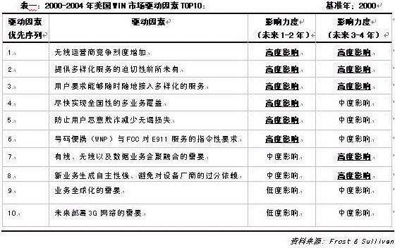根據(jù)Frost & Sullivan 分析預(yù)測(cè),2000-2004年美國WIN設(shè)備市場(chǎng)呈現(xiàn)相對(duì)均衡的發(fā)展趨勢(shì),其TOP10的影響因素與影響力度見下表: