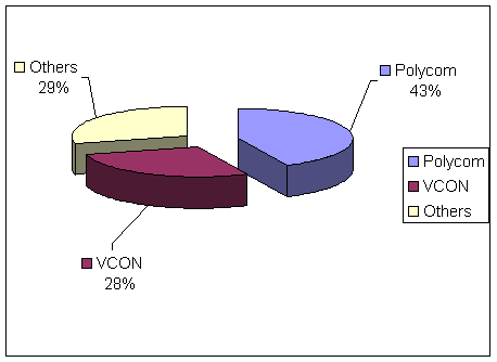 表4和圖3顯示了2001年桌面視頻會(huì)議市場(chǎng)競(jìng)爭(zhēng)廠(chǎng)商銷(xiāo)售額市場(chǎng)份額,表2和圖2顯示了銷(xiāo)售量的市場(chǎng)份額。隨著新產(chǎn)品的和新廠(chǎng)商的進(jìn)入,競(jìng)爭(zhēng)態(tài)勢(shì)將在未來(lái)不斷變化。目前該市場(chǎng)上兩個(gè)最大的廠(chǎng)商是Polycom和VCON, 其他一些小廠(chǎng)商市場(chǎng)份額較小。