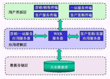 數(shù)據(jù)存儲(chǔ)層中以關(guān)系模型存儲(chǔ)了營(yíng)銷(xiāo)管理、一站服務(wù)、客戶(hù)檔案與客戶(hù)服務(wù)功能模塊所需的客戶(hù)、業(yè)務(wù)數(shù)據(jù);應(yīng)用邏輯層的WEB服務(wù)器向用戶(hù)界面層的瀏覽器提供WEB訪問(wèn)服務(wù),應(yīng)用服務(wù)器上的程序完成實(shí)際的業(yè)務(wù)邏輯,并將需向前臺(tái)返回的結(jié)果從數(shù)據(jù)庫(kù)中取出,交給WEB服務(wù)器;而前端的用戶(hù)界面層負(fù)責(zé)向用戶(hù)展現(xiàn)最終的處理結(jié)果。