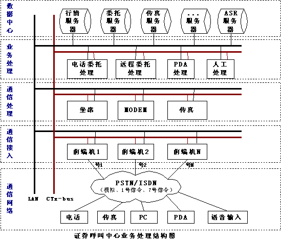 另一種方案是PDA和證券營業(yè)部前端機(jī)(實(shí)際就是電話委托前端機(jī))采用FSK通訊方式,使用電話委托的通道來完成所有的委托查詢。這種方式的速度快,信息容量大,保密性強(qiáng),而且營業(yè)部不需單獨(dú)申請電話線路,PDA和電話委托線路可動態(tài)分配,使其電話線路得到最大限度的利用。另外,營業(yè)部對外形象也好,只用一個號碼就可讓股民完成電話委托、PDA委托等多種委托方式,給股民帶來了方便。不過這種方式需要得到電話語音卡提供廠商的產(chǎn)品技術(shù)支持,語音卡必須同時支持標(biāo)準(zhǔn)的DTMF和FSK的方式,卡上有充足的能力來處理兩種方式,在語音處理卡的底層驅(qū)動應(yīng)該將電話和PDA的委托區(qū)別開來,目前市場能夠完全支持這種應(yīng)用的只有深圳市東進(jìn)通訊技術(shù)股份有限公司的產(chǎn)品,東進(jìn)技術(shù)的新一代PCI系列語音卡數(shù)字卡和模擬卡都完全采用DSP(數(shù)字信號處理器)架構(gòu),卡上有專用DSP來處理DTMF和FSK的收發(fā),是目前PDA委托前端的最好選擇;這種方案還應(yīng)該得到證券電話委托系統(tǒng)的開發(fā)商的支持,在電話委托系統(tǒng)里增加處理PDA委托的功能。目前恒基偉業(yè)的“股靈通”就是采用這種方式。