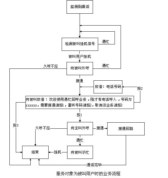 當(dāng)服務(wù)對(duì)象是被叫用戶(hù)時(shí),產(chǎn)生遇忙漏話后,東進(jìn)漏話監(jiān)測(cè)設(shè)備(DMCS)實(shí)時(shí)檢測(cè)被叫用戶(hù)的掛機(jī)信號(hào),如果被叫掛機(jī),則先向被叫外呼,呼出接通后,語(yǔ)音提示“歡迎使用遇忙回呼業(yè)務(wù),剛才有電話呼入,號(hào)碼為xxxxxx,需要接通請(qǐng)按1,重聽(tīng)號(hào)碼請(qǐng)按2,取消該業(yè)務(wù)請(qǐng)按3”,如按1,系統(tǒng)向原主叫外呼(亦稱(chēng)回呼),回呼成功(ACM)后,建立話音回路,進(jìn)一步接續(xù);如回呼原主叫時(shí)遇忙(SLB、STB等),則回呼失敗,向被叫用戶(hù)示忙。