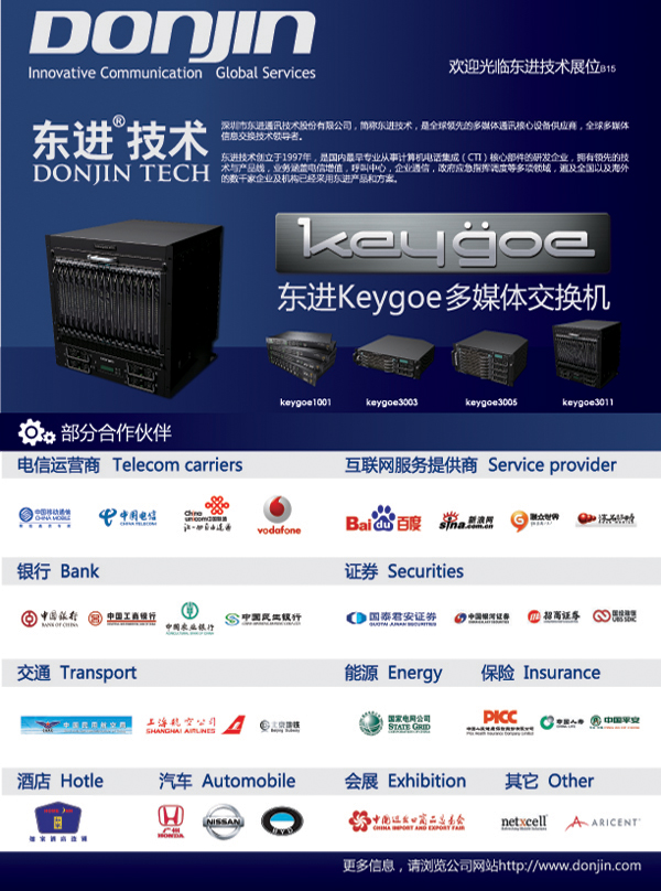 全球領(lǐng)先的多媒體通訊核心設(shè)備供應(yīng)商深圳市東進通訊技術(shù)股份有限公司,創(chuàng)立于1997年,是政府認定的高新技術(shù)企業(yè),“創(chuàng)新通訊”的倡導(dǎo)者。作為國內(nèi)最早專業(yè)從事計算機電話集成(Computer Telephony Integration,簡稱CTI)核心部件的研發(fā)企業(yè),公司聚集了一流的產(chǎn)品研發(fā)工程師,始終保持全球技術(shù)領(lǐng)先地位。東進產(chǎn)品的裝機端口數(shù)穩(wěn)居同行業(yè)第一位。