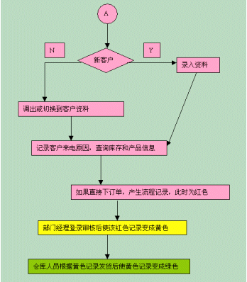 可以根據(jù)訂單上的不同顏色來判斷流程走到的階段。流程開始時(shí)候,訂單的列表中會(huì)產(chǎn)生一條紅色記錄,部門經(jīng)理登錄審核后使該紅色記錄變成黃色,倉(cāng)庫(kù)人員根據(jù)黃色記錄發(fā)貨后使黃色記錄變成綠色。