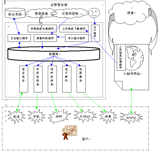 面對越來越激烈的競爭,各個券商使出渾身解數(shù),推出如透支、手續(xù)費返還等各種吸引客戶的手段;運用各種各樣的的交易方式如:營業(yè)部大戶室、家庭遠程大戶室、網(wǎng)上交易、電話委托以及手機炒股、股易通、WAP網(wǎng)上交易等等。然而,這些都屬于被動的服務(wù)方式,對于業(yè)余炒股的大多數(shù)中小戶、散戶來說,不可能每天花數(shù)小時瀏覽股市的各種信息。因此,不知道配股繳款、錯過配售新股等情況時有發(fā)生,給客戶造成較大的經(jīng)濟損失;一些重大消息、重大新聞不能及時獲知,延誤了投資的有利時機。據(jù)調(diào)查,目前參加二級市場配售的投資者比例不足20%。
