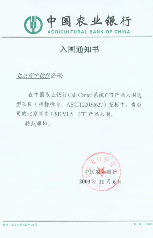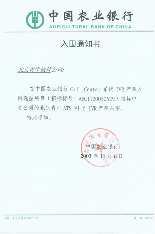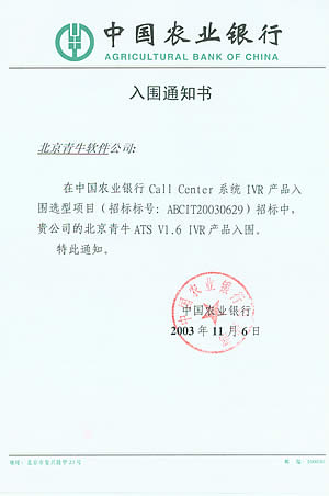 中國農(nóng)業(yè)銀行是四大國有獨資商業(yè)銀行之一,被《財富》評為世界500強企業(yè)之一。目前農(nóng)行已在全國范圍內(nèi)開通95599特服電話短號碼,為進一步整合現(xiàn)有電話銀行和客服中心資源,提高客戶滿意度和忠誠度,并通過客服中心的渠道,加快農(nóng)行金融產(chǎn)品的推廣,中國農(nóng)業(yè)銀行將在全國36個省域分行的基礎(chǔ)上加快建設(shè)成總行集中管理、標(biāo)準(zhǔn)服務(wù)集中、特色服務(wù)分散,統(tǒng)一客戶服務(wù)界面的全國客戶服務(wù)中心系統(tǒng)。為此,中國農(nóng)業(yè)銀行科技部就Call Center系統(tǒng)的關(guān)鍵性產(chǎn)品,CTI、PBX、 IVR產(chǎn)品向國內(nèi)外著名廠商進行入圍招標(biāo)活動,參與廠商匯集國內(nèi)外各大知名企業(yè),是一次國際水平的重量級選型過程。通過嚴(yán)格的技術(shù)測試和綜合考評,中國農(nóng)業(yè)銀行確認(rèn)了Call Center系統(tǒng)的入圍產(chǎn)品廠商名單,青牛軟件的CTI產(chǎn)品-青牛USE,IVR產(chǎn)品-青牛ATS在多項測評中名列前茅。