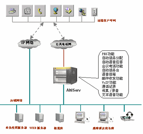 - 話務自動分配ACD功能:對撥入系統(tǒng)內部的電話,可以選用撥入電話自動分配到員工的話機上,如對同一個業(yè)務功能相同的部門, AltiWare