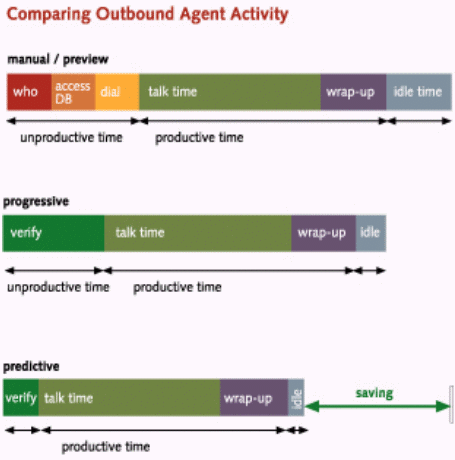 預(yù)覽撥號(hào) 在坐席代表與客戶交談之前必須要知道客戶情況時(shí)使用。預(yù)覽撥號(hào)比手工撥號(hào)效率稍高一些,因?yàn)榭蛻舻脑敿?xì)信息會(huì)呈現(xiàn)在坐席代表屏幕上并且呼叫僅在坐席代表準(zhǔn)備好時(shí)才會(huì)撥出。預(yù)覽撥號(hào)節(jié)約了撥電話號(hào)碼的"手指時(shí)間"并且能夠增加聯(lián)絡(luò)列表管理的效率。然而,總體來(lái)說(shuō)坐席代表的通話時(shí)間典型地在大約每小時(shí)18到20分鐘。