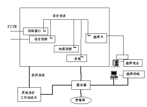 所謂的PC方式就是計算機+語音板卡,即在微機平臺上集成各種功能的資源處理卡,完成通信接口、語音處理、傳真處理、座席轉(zhuǎn)接等功能,再結(jié)合外部的計算機網(wǎng)絡實現(xiàn)各種應用系統(tǒng)的需求。整個系統(tǒng)是一個Client/Server結(jié)構(gòu)的微機網(wǎng)絡。