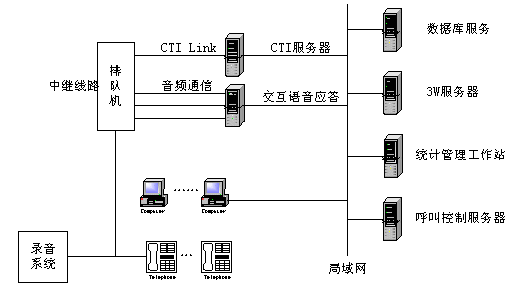 ACD方式即前置交換機+語音服務器,即在專用交換機+ACD(自動話務分配)的基礎上擴展功能,用CTI技術實現(xiàn)通信和計算機的功能結(jié)合,并配以必要的語音和數(shù)據(jù)庫系統(tǒng)。