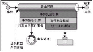 在路由管道中流轉(zhuǎn)著加載了業(yè)務(wù)的工作流事件。事件按照事先定義的路由規(guī)則流轉(zhuǎn),事件的路由規(guī)則定義了事件在路由管道中可以停靠的“站臺”,同時定義了事件到達“站臺”時可以領(lǐng)取并處理加載在事件上的業(yè)務(wù)的角色。事件從始發(fā)站臺進入路由管道,經(jīng)過一個或多個中間站臺,最后到達終點站。事件每停靠一個站臺,相關(guān)人員領(lǐng)取事務(wù),并進行處理后重新裝載事務(wù),觸發(fā)事件向下一個站臺流轉(zhuǎn),除非事件已經(jīng)到達終點站。