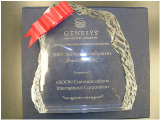 在2006年8月結(jié)束的澳洲墨爾本G-Force會(huì)議上,Genesys將 “2005年亞太地區(qū)最佳市場拓展”(2005 Market Development Award,APAC)獎(jiǎng)項(xiàng)授予億迅,億迅總裁李冰影女士出席頒獎(jiǎng)儀式并代表公司領(lǐng)取該獎(jiǎng)。