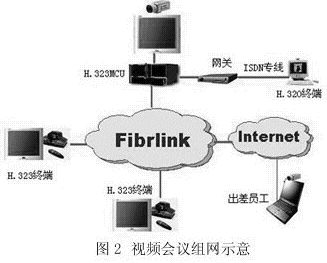 目前視頻會(huì)議系統(tǒng)主要有兩大類(lèi):一種基于H.320協(xié)議標(biāo)準(zhǔn),另一種基于H.323協(xié)議標(biāo)準(zhǔn)。H.320會(huì)議系統(tǒng)技術(shù)成熟,運(yùn)行穩(wěn)定,圖像質(zhì)量高,但業(yè)務(wù)功能單一,組網(wǎng)不夠靈活;H.323會(huì)議系統(tǒng)是最近兩年興起的視頻會(huì)議系統(tǒng),運(yùn)行在廣泛存在的IP網(wǎng)絡(luò)之上,以功能豐富、組網(wǎng)方便靈活等為主要特征,成為視頻會(huì)議系統(tǒng)的發(fā)展方向,但其視頻質(zhì)量很大程度上依賴于所承載的IP網(wǎng)絡(luò)的質(zhì)量。中電飛華公司基于FibrLINK平臺(tái),為用戶提供H.320、H.323以及H.320和H.323混合組網(wǎng)的視頻會(huì)議系統(tǒng)建設(shè),如圖2所示。