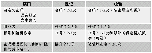 對(duì)Nuance方案,鑒別使用的密碼接口方案或類型都不受限制。各公司可自由選擇最適合于應(yīng)用系統(tǒng)的任何接口;如果以后覺(jué)得別的接口更加有效,用戶無(wú)需選擇新的技術(shù)提供商即可改變接口。聲紋鑒別中的這種靈活性和實(shí)用性是前所未有的。下表列出部分Nuance可實(shí)現(xiàn)的不同用戶接口: