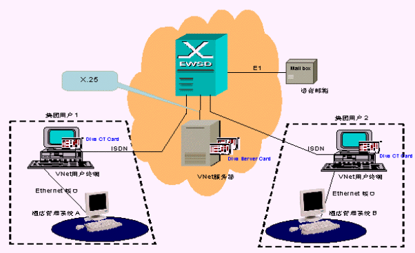 圖中集團(tuán)用戶1與集團(tuán)用戶2內(nèi)部使用了配置Eicon 公司Diva CT Card的Vnet系統(tǒng)用戶終端,同時(shí)接入ISDN設(shè)備與EWSD交換機(jī)連接,信號(hào)通過(guò)EWSD交換機(jī)響應(yīng)給配置Eicon