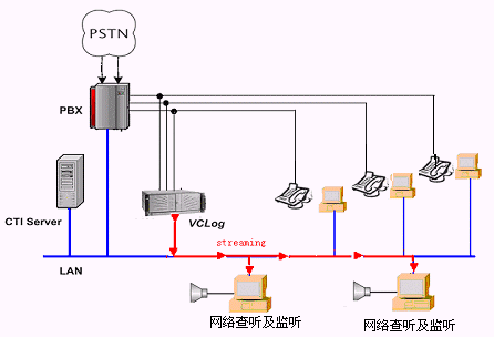 在此項目中,宇高多媒體錄音系統(tǒng)(VCLog)采用時下最為流行、先進的網(wǎng)絡(luò)技術(shù)(流媒體技術(shù)):VCLog網(wǎng)絡(luò)查聽及實時監(jiān)聽錄音功能模塊軟件(VCLog LineMonitor)采用流式傳輸?shù)姆绞剑脩舨槐氐鹊秸麄文件全部下載完畢,而只需經(jīng)過幾秒啟動延時即可進行聽取。當(dāng)聲音等媒體在客戶機上播放時,文件的剩余部分將在后臺從服務(wù)器內(nèi)繼續(xù)下載。流式傳輸不僅使啟動延時成十倍、百倍地縮短,而且不需要太大的緩存容量,即使在網(wǎng)絡(luò)非常擁擠或很差連接條件下,也能提供清晰、不中斷的語音給用戶,大大的降低了網(wǎng)絡(luò)的負載,保證網(wǎng)絡(luò)資源應(yīng)用的安全性和穩(wěn)定性;