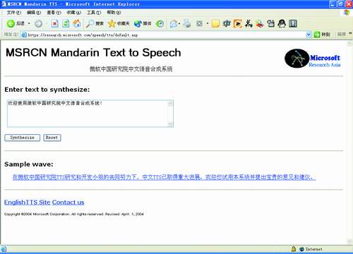 通過“木蘭”在線演示系統(tǒng):“http://research.microsoft.com/speech/tts”(中文)與“http://research.microsoft.com/speech/engtts”(英文),人們可以親身體驗(yàn)MSRA的研究成果。