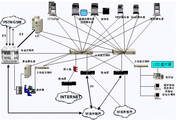 用戶撥打聯(lián)通客戶服務(wù)系統(tǒng)特服號(hào)碼1001,呼叫經(jīng)過(guò)電話網(wǎng)絡(luò)匯接到省中心匯接局,然后接入本系統(tǒng)。本系統(tǒng)的呼叫匯接采用《中國(guó)聯(lián)通客戶服務(wù)系統(tǒng)技術(shù)規(guī)范書》規(guī)定的匯接方式。