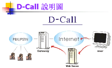 由金倚公司在貴網(wǎng)站的網(wǎng)頁上安裝D-CALL軟件,并配上金倚公司開發(fā)的硬件,將您網(wǎng)站要指定D-CALL 直撥的電話號(hào)碼或分機(jī)設(shè)定在D-CALL程序中,就可以享受D-CALL的功能了。(需要的環(huán)境如右圖示