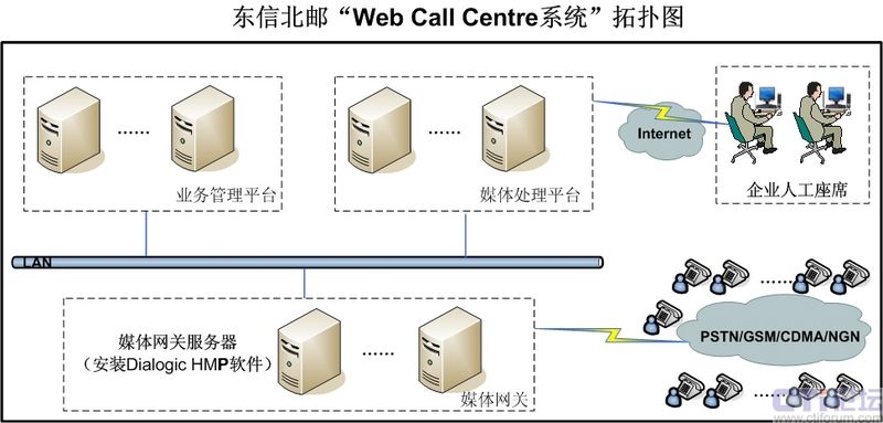 由于呼叫中心建設(shè)涉及技術(shù)十分專業(yè)、涉及領(lǐng)域也比較廣泛,必須投入巨大的資金購(gòu)買軟硬件設(shè)備,因此對(duì)于中小企業(yè)而言建設(shè)自有的呼叫中心顯得不切實(shí)際。正是基于這種情況,東信北郵開(kāi)始采用Dialogic HMP系統(tǒng)軟件建設(shè)呼叫中心系統(tǒng),以托管方式為中小企業(yè)提供呼叫中心服務(wù),即Web Call Centre服務(wù)。在項(xiàng)目建設(shè)過(guò)程中,東信北郵需要慎重選擇媒體處理軟件方案,努力做到突破傳統(tǒng)硬件方案的約束,力爭(zhēng)在系統(tǒng)靈活性、系統(tǒng)成本、系統(tǒng)可管理性、開(kāi)發(fā)周期等方面獲得突破。