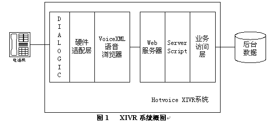 采用Hotvoice XIVR系統(tǒng)實(shí)現(xiàn)的新業(yè)務(wù)可以采用任何Web技術(shù)方便地和原有數(shù)據(jù)系統(tǒng)結(jié)合。用戶(hù)可以根據(jù)業(yè)務(wù)需求編寫(xiě)靜態(tài)voiceXML腳本,或采用ASP/JSP/PHP等動(dòng)態(tài)生成voiceXML腳本;與后臺(tái)數(shù)據(jù)系統(tǒng)間可以采用數(shù)據(jù)庫(kù)訪(fǎng)問(wèn),或采用XML/HTTP/DCOM或其他協(xié)議訪(fǎng)問(wèn)。