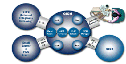 CICM是ITI解決方案中的核心模塊,該模塊完成系統(tǒng)涉及到互聯(lián)網(wǎng)的所有通話的控制,包括VOIP、E-mail、Chatting、畫像通話等。而該模塊與CICR的連動正是完成CTI和ITI技術(shù)完美結(jié)合的關(guān)鍵。即當(dāng)一個網(wǎng)上呼叫呼入時,由CICR返回所分配的話務(wù)員相關(guān)信息(如:IP),然后CICM將該信息送給客戶使得網(wǎng)絡(luò)聊天和WEB到電話的通話得以同步。而CCPM