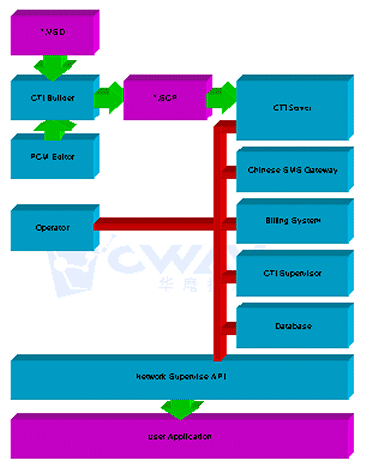 說明:圖中所有的設(shè)備都是通過網(wǎng)絡(luò)和CTI服務(wù)器交互的,我們內(nèi)部都是通過遠程監(jiān)控API接口與服務(wù)器通信,也就是說,只要用戶可以按照遠程監(jiān)控API的規(guī)范開發(fā)出具有自己特色的計費系統(tǒng)、監(jiān)控系統(tǒng)等等。