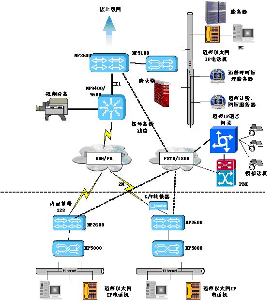 目前許多公安系統(tǒng)雖然采用具有IP語音功能的路由設(shè)備組建網(wǎng)絡(luò),但在業(yè)務(wù)語音交流通常還通過PBX集團(tuán)交換機(jī)走電信PSTN/ISDN電話網(wǎng),這樣無法節(jié)省電話費(fèi)用,反而增加了辦公費(fèi)用。邁普IP語音解決方案采用了邁普MyPower VG2000IP語音網(wǎng)關(guān)和邁普以太網(wǎng)IP電話進(jìn)行改造。在整個(gè)網(wǎng)點(diǎn)語音終端全部設(shè)備選用經(jīng)濟(jì)型邁普以太網(wǎng)IP電話機(jī),它采用雙以太口設(shè)計(jì),使網(wǎng)絡(luò)無需重新布線,同時(shí)也可使用已有的路由器上IP語音模塊;邁普以太網(wǎng)IP電話機(jī)之間的話音通信通過邁普呼叫管理服務(wù)器集中控制。在主體IP網(wǎng)絡(luò)中,邁普IP語音網(wǎng)關(guān)放置于中心機(jī)房作為傳統(tǒng)PSTN的出口,可以通過VOS接口、E1接口(中國一號(hào)信令)、E&M接口等多種方式接入公安PBX,將PSTN線路傳來的時(shí)分話音或傳真信息進(jìn)行分組和壓縮,轉(zhuǎn)換成IP數(shù)據(jù)包,通過路由設(shè)備路由到目的地;在沒有PBX的公安機(jī)房,邁普IP語音網(wǎng)關(guān)可以提供32路的模擬用戶接口,可以完全替代傳統(tǒng)PBX并接入PSTN,并提供額外功能,如圖中虛線所示;整個(gè)方案還可以針對(duì)公安用戶特殊需求"定做"特色功能,例如緊急告警等方便日常辦公。