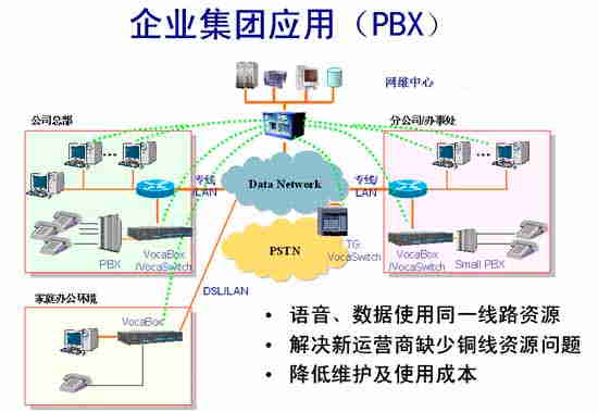在總部、各個(gè)分公司、辦事處按照容量的大小可以安裝多臺VocaBox/IAD,并利用VocaBox自帶的FXO接口與本地PSTN網(wǎng)互通,在總部可用VocaSwitch的E1接口與PSTN互通。