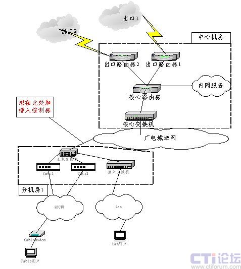 南通廣電目前的IP網(wǎng)絡拓撲如下圖所示,現(xiàn)有電視塔總前端機房1個;分機房共有4個,每個分機房的情況相同。個人用戶以cable modem用戶為主,用戶通過HFC網(wǎng)絡接入頭端(cmts),再經(jīng)匯聚交換機接入廣電城域網(wǎng)后經(jīng)電視塔總前端機房訪問internet,新的頭端系統(tǒng)采用Cisco 公司的ubr10012和ubr7246,目前暫決定cable modem和用戶的PC設備均通過DHCP服務器(Cisco 的CNR軟件)獲得IP地址;Lan用戶除接入方式不同外,IP地址采用靜態(tài)分配的辦法。目前廣電為部分個人用戶分配公網(wǎng)IP地址,其他個人用戶分配私網(wǎng)地址由出口防火墻通過NAT完成地址轉換。