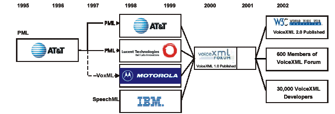 VoiceXML 是由IBM 、Lucent、Motorola 和AT&T 四家公司于2000年提出的一種應(yīng)用于語(yǔ)音瀏覽的標(biāo)記語(yǔ)言。如下圖所示,VoiceXML是各廠商多年經(jīng)驗(yàn)積累的產(chǎn)物,VoiceXML