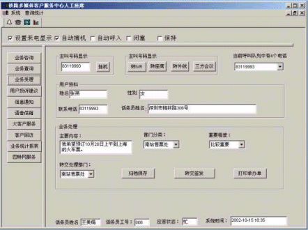 本鐵路客戶服務(wù)中心系統(tǒng)具有售票處/代售點(diǎn)等咨詢、列車信息等查詢、定票/退票/改票等業(yè)務(wù)受理、用戶投訴與建議、車次調(diào)整/貨物到站等信息自動通知、客戶回訪與滿意度調(diào)查、語音信箱留言服務(wù)以及系統(tǒng)綜合管理等全方位功能;并且結(jié)合圖形化的管理、監(jiān)控界面,使得廣大旅客隨時(shí)隨地可以利用身邊的各種通訊工具享受到鐵路部門提供的各種信息服務(wù)。