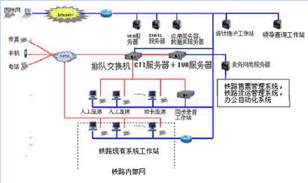 鐵路客戶服務(wù)中心系統(tǒng)主要是由帶語音板卡的計(jì)算機(jī)或排隊(duì)交換機(jī)、CTI服務(wù)器、IVR服務(wù)器、應(yīng)用服務(wù)器/數(shù)據(jù)庫服務(wù)器、人工座席系統(tǒng)等硬件設(shè)備和應(yīng)用軟件組成。它以電話服務(wù)為主要服務(wù)方式、結(jié)合計(jì)算機(jī)信息系統(tǒng)的資料數(shù)據(jù),為客戶提供全方位的服務(wù),包括業(yè)務(wù)查詢、業(yè)務(wù)咨詢、業(yè)務(wù)受理、投訴和建議、市場調(diào)查等功能。