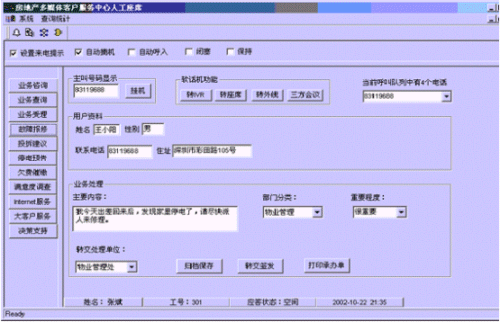 。。接通呼叫中心的電話后,按語(yǔ)音提示選擇相應(yīng)的服務(wù),選擇相應(yīng)的服務(wù)功能鍵后,在服務(wù)人員的計(jì)算機(jī)屏幕上自動(dòng)彈出對(duì)話框顯示用戶的詳細(xì)信息。