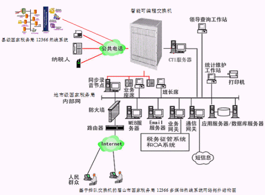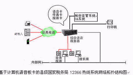 對于縣級國家稅務(wù)局12366多媒體納稅服務(wù)熱線系統(tǒng),則建議使用基于計算機(jī)語音板卡的方式,可以減少投資,同時具有良好的系統(tǒng)性能;對于地市級-縣級國家稅務(wù)局12366多媒體納稅服務(wù)熱線系統(tǒng),可選用排隊交換機(jī)作為語音接入設(shè)備,以保障系統(tǒng)的高可靠性和穩(wěn)定性;大大提高了系統(tǒng)的適應(yīng)面。