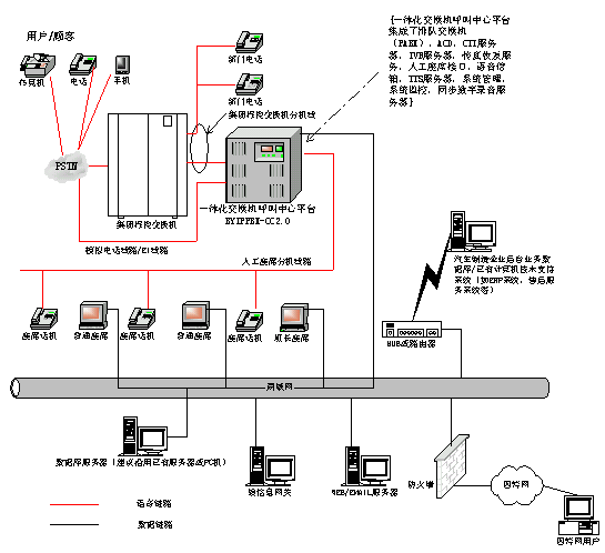 基于一體化交換機的汽車制造企業(yè)多媒體客戶服務(wù)中心系統(tǒng)產(chǎn)品BYQCZZ-CC2.0的網(wǎng)絡(luò)拓?fù)浣Y(jié)構(gòu)如下:
