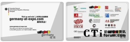 CTI論壇(ctiforum)5月17日消息(記者 潘婷婷):2010年5月,世人矚目的上海世博會已經(jīng)隆重開幕,德國館是其中的大熱門之一。想一睹德國館的風采,一般都需要排2~3個小時的長隊。而觀眾可能不知道除了德國國家館外,德國還有多個城市在浦西的城市最佳實踐區(qū)展出。為了讓觀眾更好、更全面地體驗德國參展的所有活動,德國駐上?傤I(lǐng)事館聯(lián)手智能卡領(lǐng)域的專家捷德公司共同推出了德國館智能參觀卡,觀眾只需持卡參觀德國的其他相關(guān)展區(qū)后,就可以不用排隊進入德國國家館了。