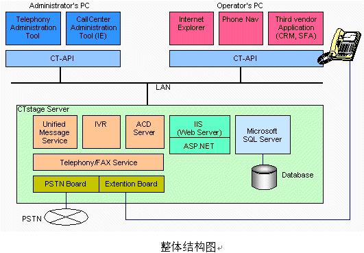 隨著經(jīng)營環(huán)境和企業(yè)環(huán)境的日益激化,作為新時代的信息策略,計算機電話集成(CTI)也由于投資小效益大而倍受注目。沖電氣公司的CTstage實現(xiàn)最先端的多媒體通信的UnPBX(在服務器中加插電話板卡,以單臺計算機實現(xiàn)PBX功能的系統(tǒng))型的開放式CTI系統(tǒng)。在一臺PC服務器上實現(xiàn)IVR和ACD功能、內(nèi)線電話控制、ACD監(jiān)視器等呼叫中心所需要的功能,成為真正意義上的UnPBX呼叫中心。先進的CTI的解決方案將作為企業(yè)的經(jīng)營策略,迅速提高適應市場的能力。