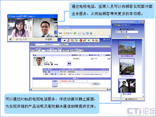 通過“FOMA”的電視電話服務(wù),可以實現(xiàn)面對用戶的表情進行服務(wù)。而且,例如,可以實時把握故障發(fā)生地點等只用語言無法準(zhǔn)確傳遞的信息。進而,客服人員可以通過FOMA的電視電話功能送出動畫、靜止畫面,利用這些畫面說明情況。通過靈活運用這些功能,為實現(xiàn)顧客和企業(yè)之間的熱情友好、高效細致的通信提供支持。